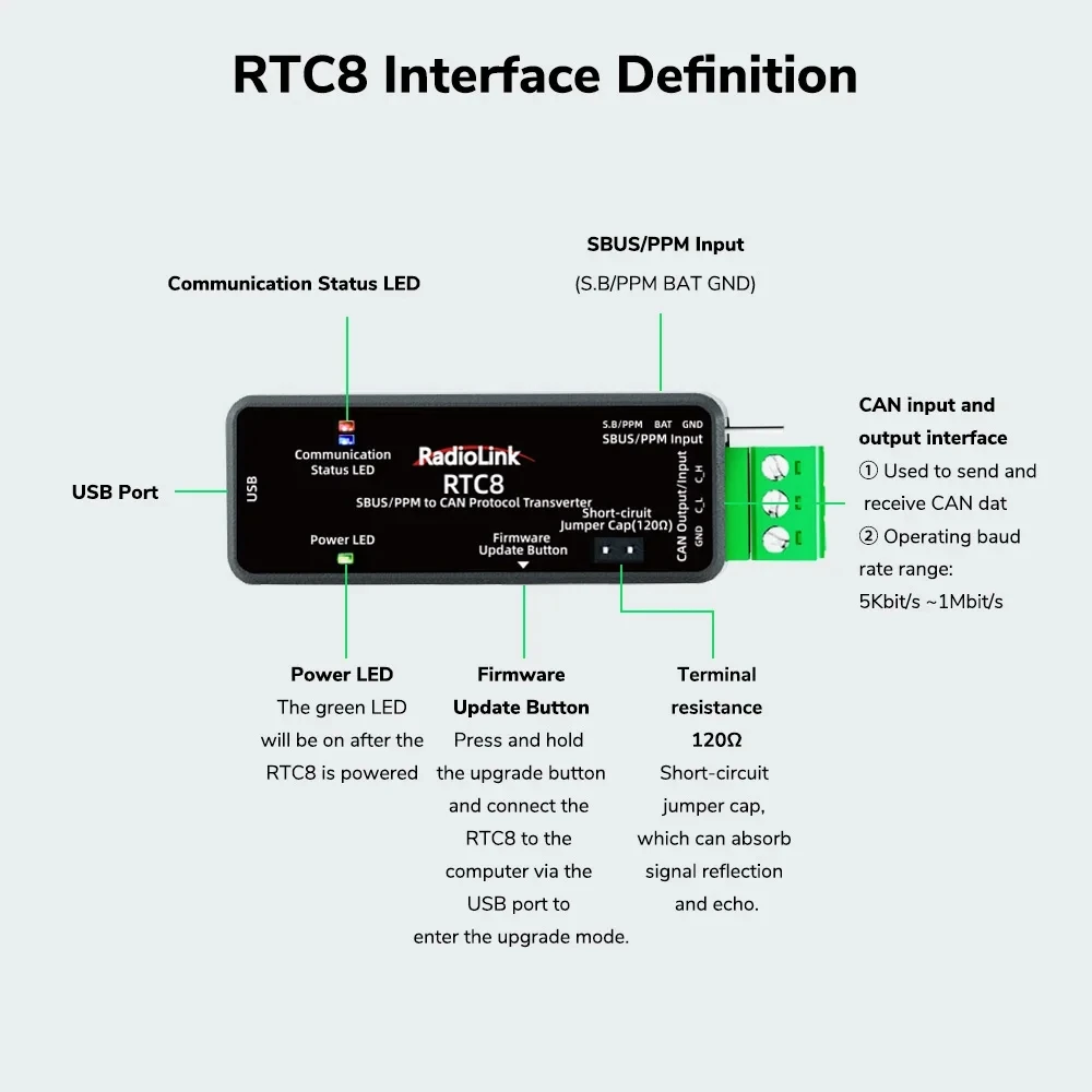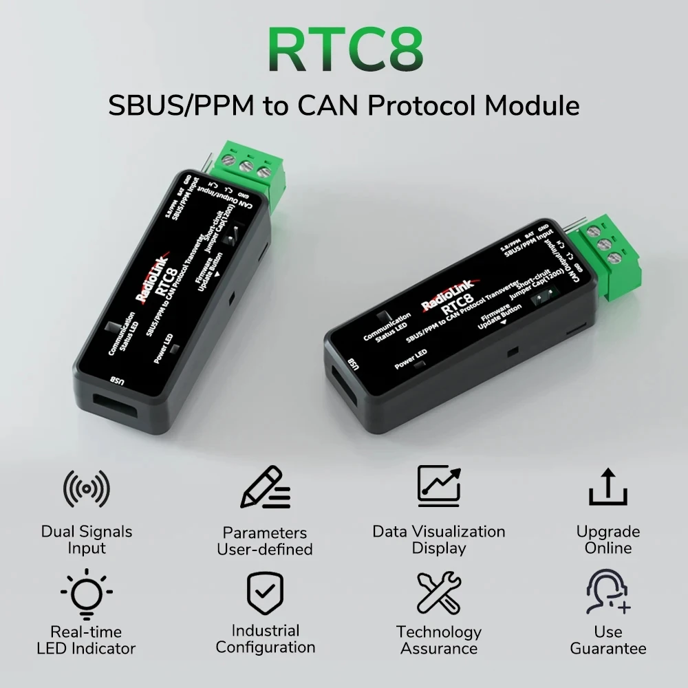 Radiolink RTC8 SBUS/PPM to CAN Protocol Module Dual Signal Input APP Parameter Customization Industrial Grade Suitable for Smart Cars/DJI Gimbal