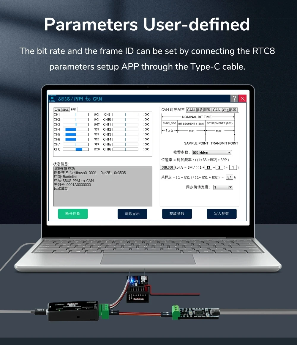 Easy to Convert the Signal: The bit rate and the frame ID can be set by connecting the RTC8 parameters setup APP through the Type-C cable. No need to modify the original CAN protocol or find a manufacturer to customize the protocol to adapt to the converter, parameters can be set as you need.