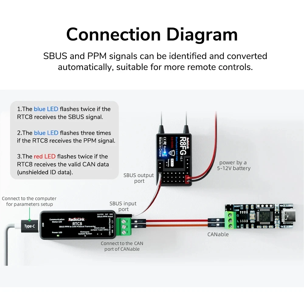 Real-time LED Indicator: Different LEDs switch automatically to identify whether the signal received is SBUS, PPM, or CAN data. ①The blue LED flashes twice if the RTC8 receives the SBUS signal. ②The blue LED flashes three times if the RTC8 receives the PPM signal. ③The red LED flashes twice if the RTC8 receives the valid CAN data(unshielded ID data).