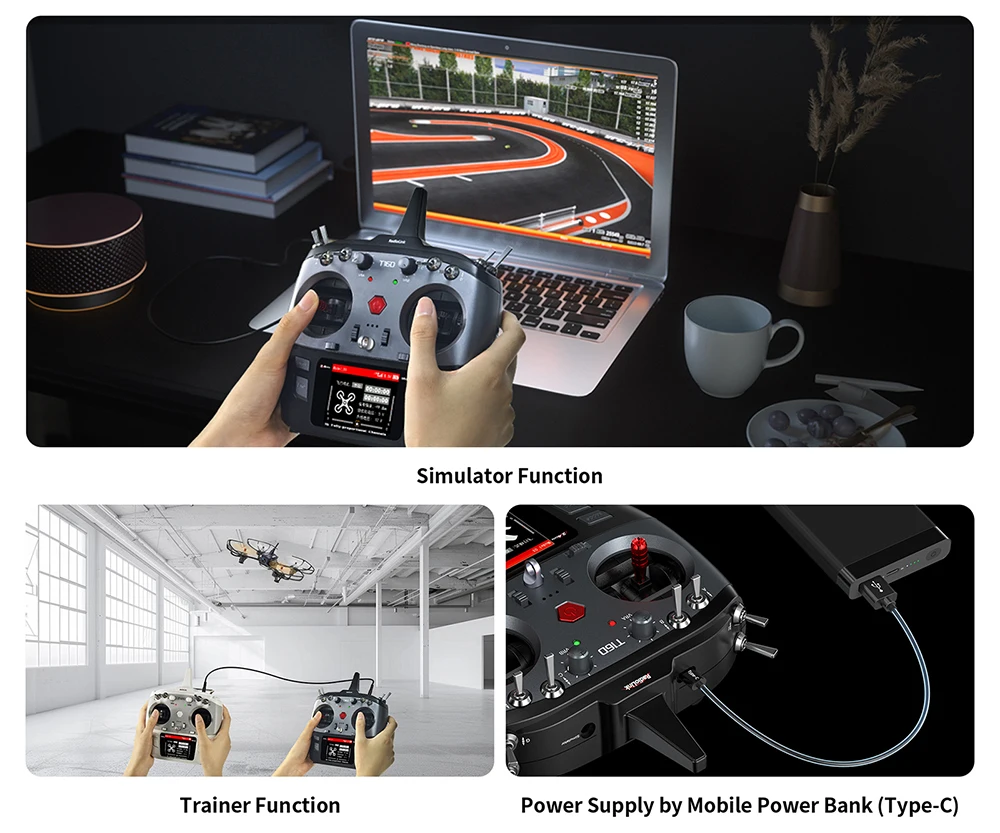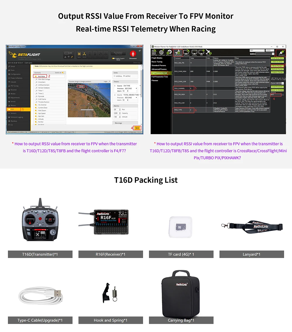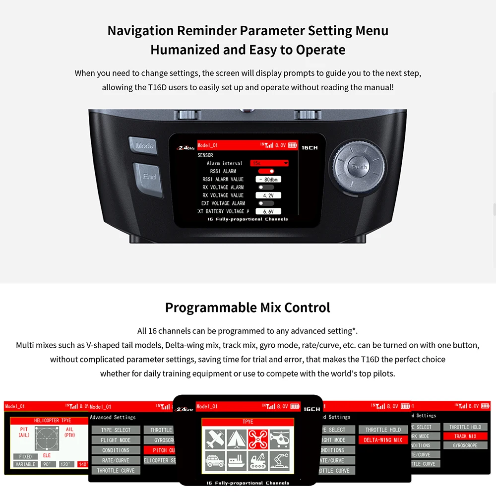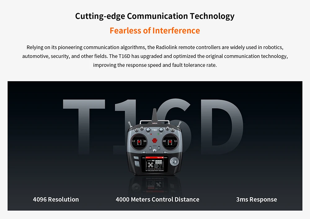 1. T16D, with 16 fully-proportional channels, Excellent Anti-interference Capability,4000 Meters Control Distance,Mainstream Operating System,Multiple Languages,Unique Personalized and Humanized Voice Broadcast Customization,Receiver Supports Upgrade Online,Humanized and Easy to Operat.