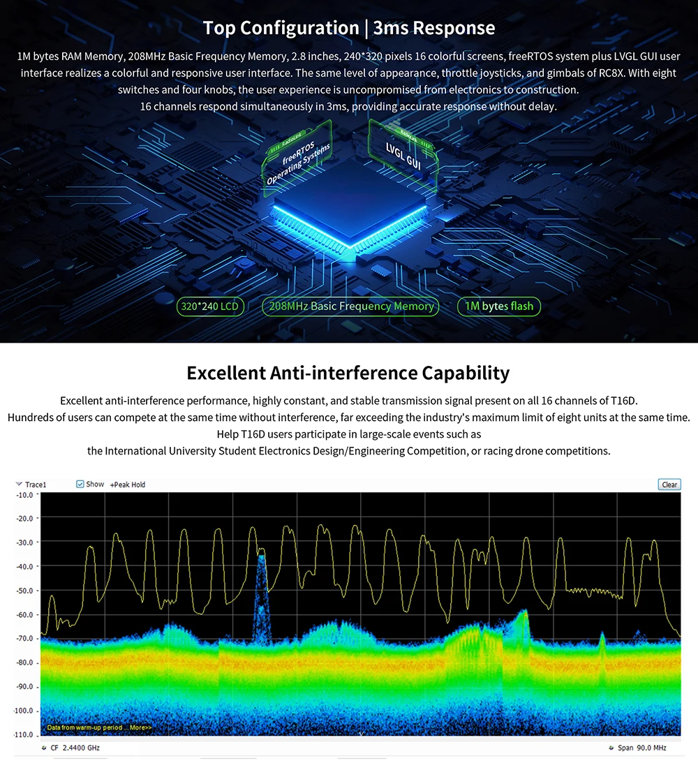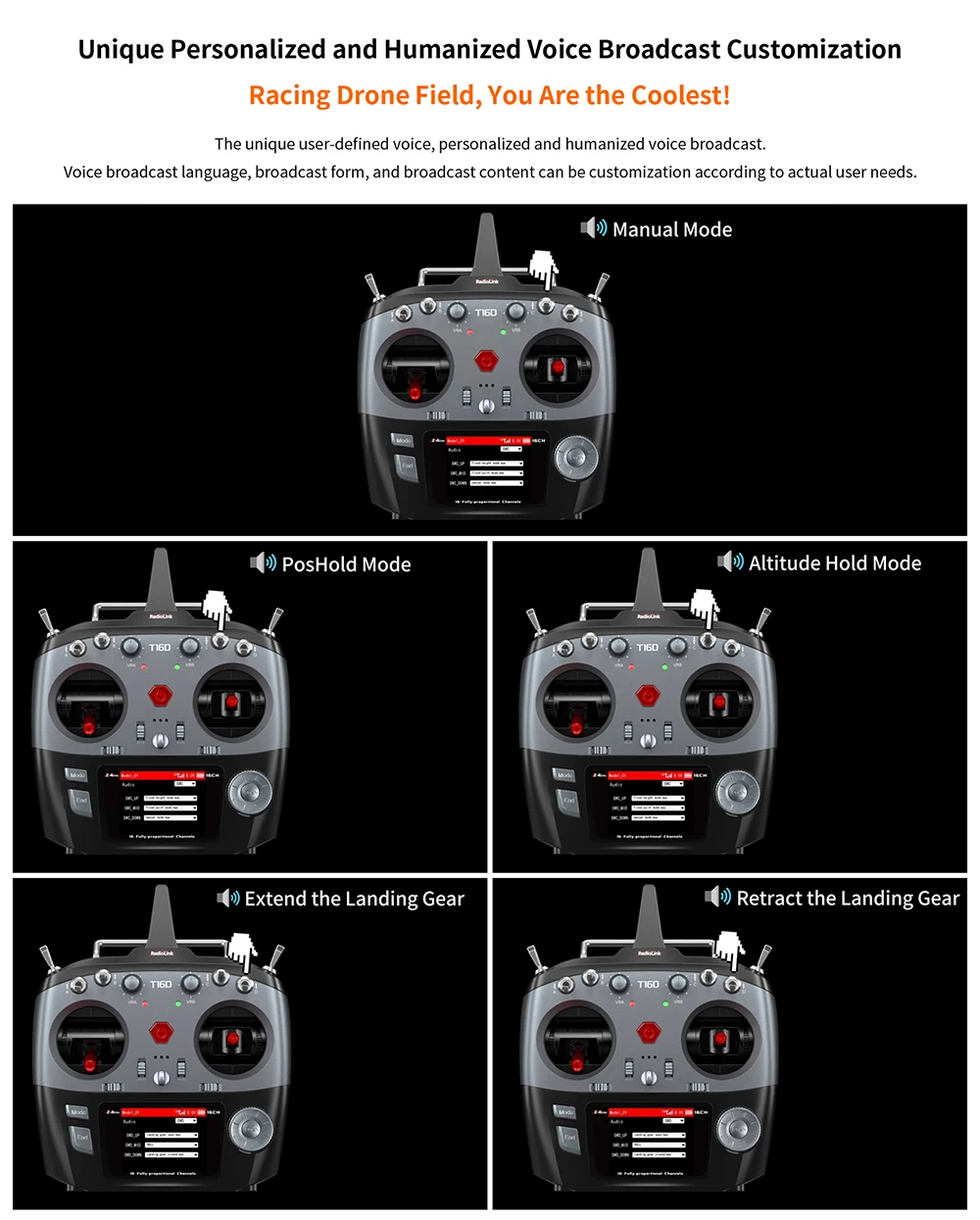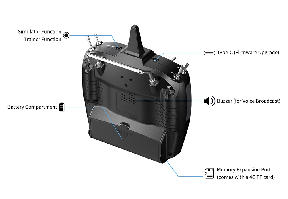 1. T16D, with 16 fully-proportional channels, Excellent Anti-interference Capability,4000 Meters Control Distance,Mainstream Operating System,Multiple Languages,Unique Personalized and Humanized Voice Broadcast Customization,Receiver Supports Upgrade Online,Humanized and Easy to Operat.