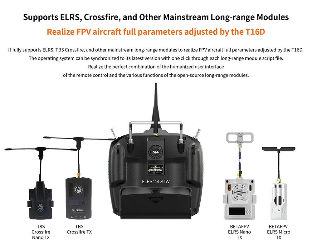 2. It fully supports ELRS, TBS Crossfire, and other mainstream long-range modules to realize FPV aircraft full parameters adjusted by the T16D.Realize the perfect combination of the humanized user interface of the remote control and the various functions of the open-source long-range modules.