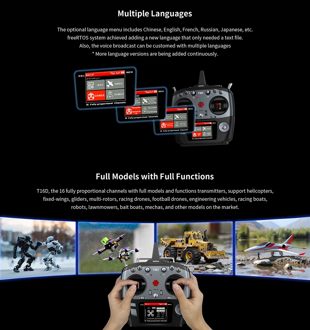 T16D is packed with a 16-channel receiver R16FG,the 16 fully proportional channels,respond simultaneously in 3ms, providing accurate response without delay.With eight switches and four knobs, the user experience is uncompromised,Rich user-defined functions can satisfy almost all products from engineering vehicles, and robots, to turbojet aircraft.