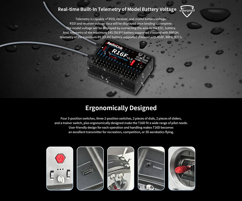 Telemetry: Real-time built-in telemetry of the model battery voltage, RSSI, and receiver voltage. R16F has built-in data transmission functions. When connected to the flight control, they can send back information such as latitude and longitude, distance, number of satellites, heading, and other information in real-time.