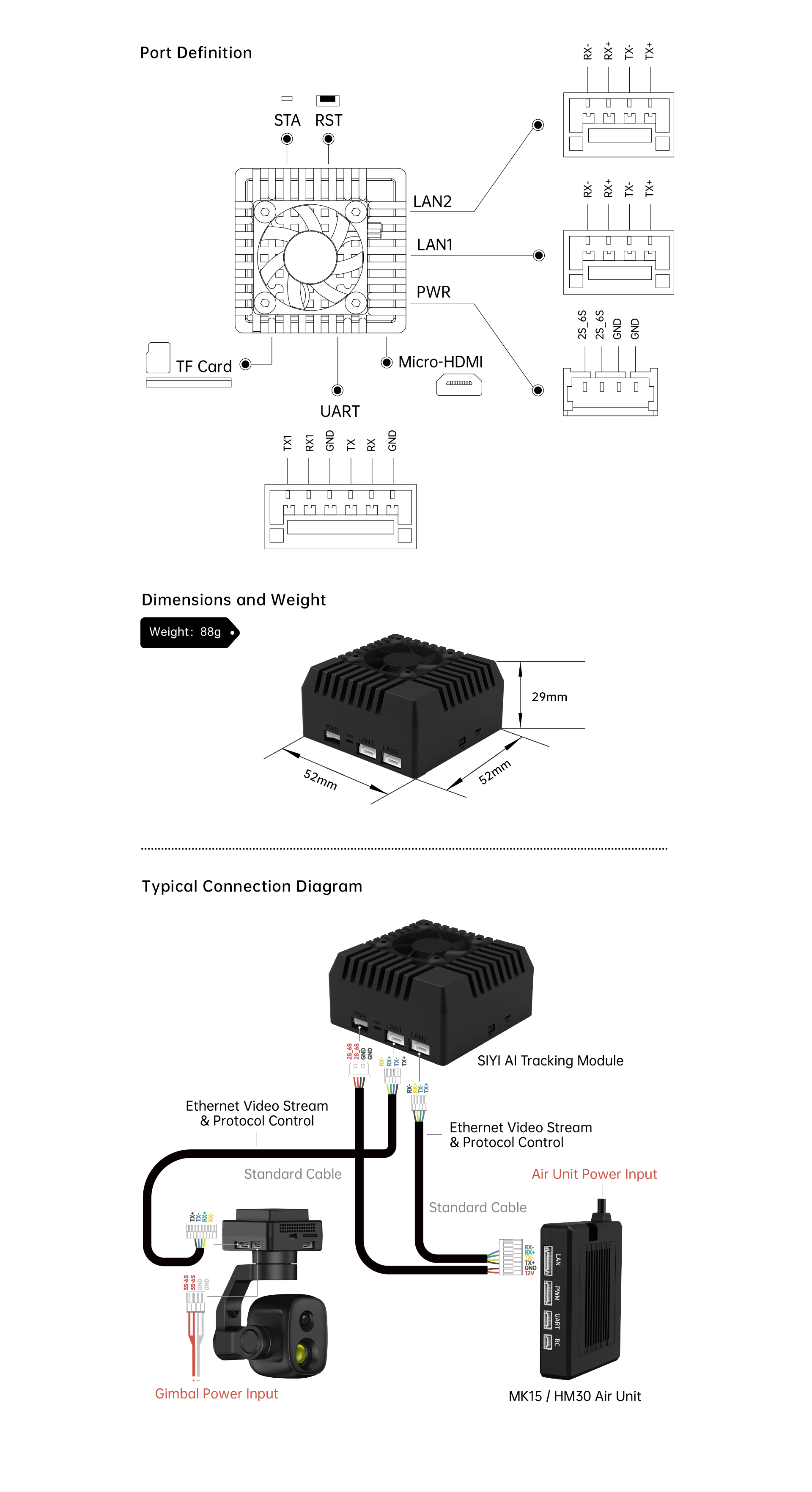 SIYI Al tracking module supports collaborative control with SIYI optical pods (gimbal cameras) to achieve real-time tracking and capture of targets and can highlight the subject in the picture through real-time focus and zoom. During the tracking process, if the target is blocked or briefly leaves the monitoring screen, Al tracking module can automatically recognize and continue tracking when it re-enters the monitoring screen Integrate attitude data between SIYI optical pod (gimbal camera) and flight controller, and switch the flight mode to guided mode to turn on the target follow function