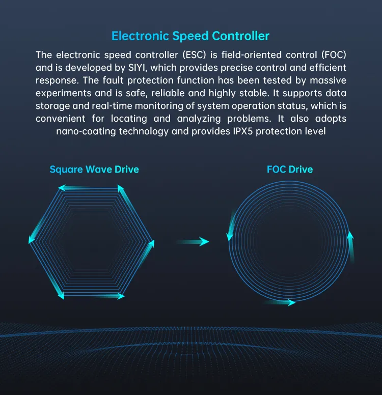 The electronic speed controller (ESC) is field-oriented control (FOC) and is developed by SIYI, which provides precise control and efficient