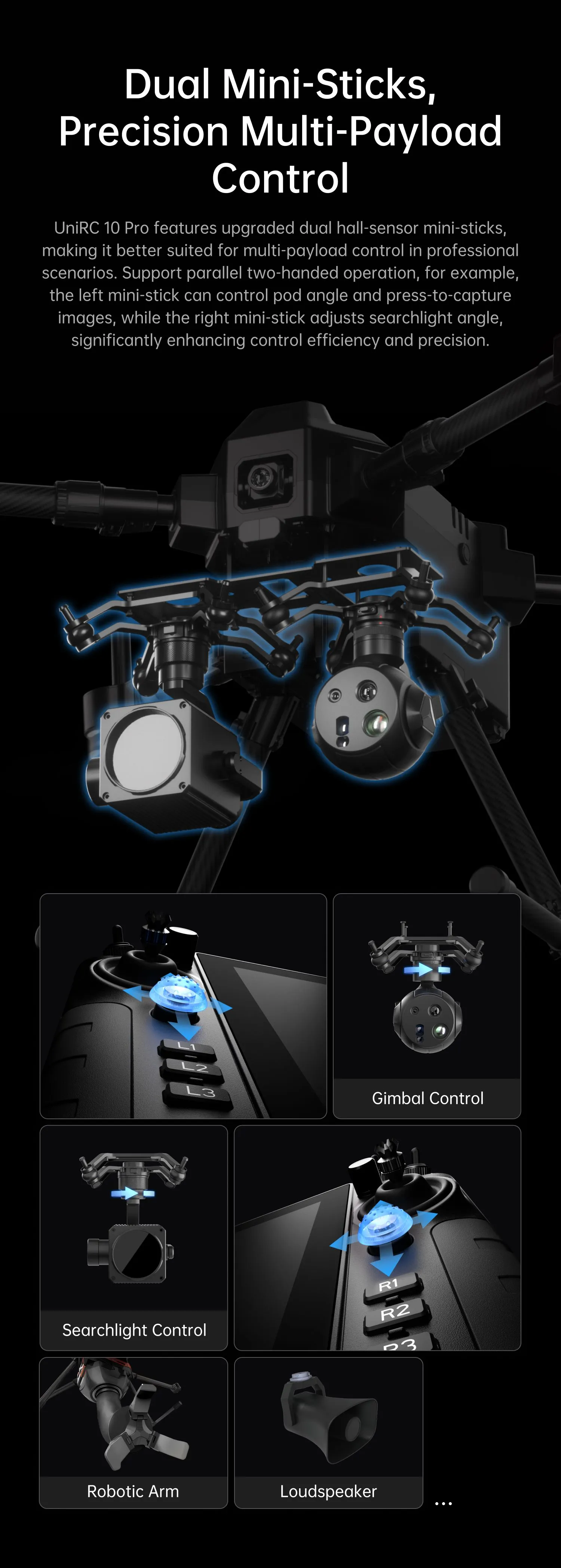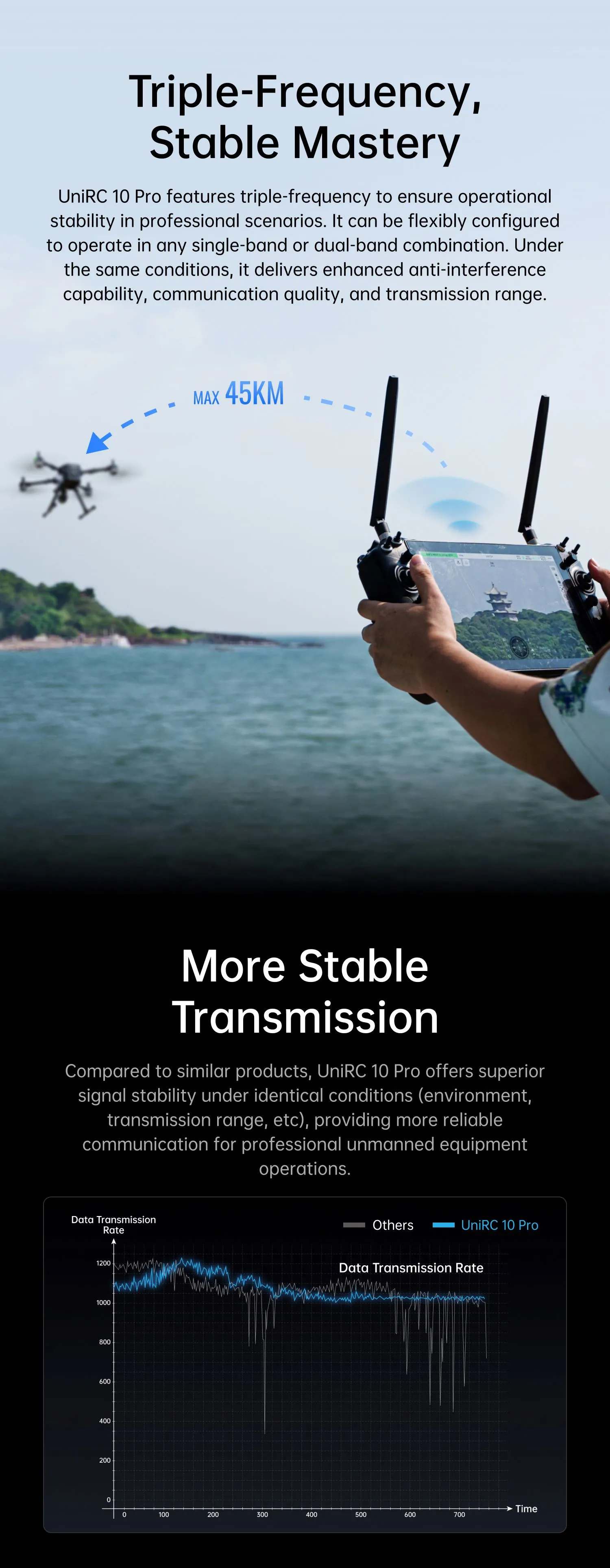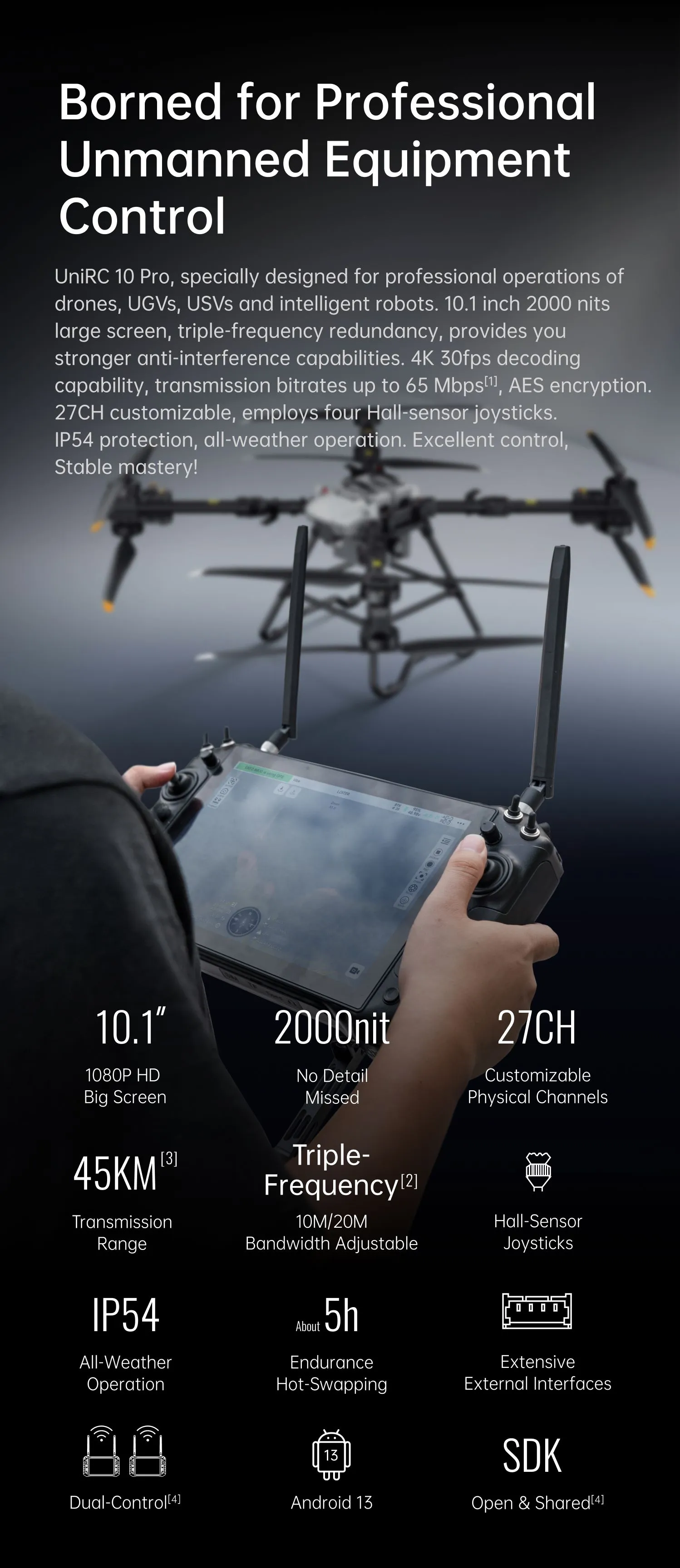 SIYI UniRC 10 Pro Triple-Frequency Professional Ground Station delivers seamless control with a 45 KM range, 10-inch 1080P bright touchscreen, and 4K digital image transmission. Features include 2.4/5/X GHz support, Android 13 OS, 4GB RAM, 64GB ROM, and robust AES encryption for UAV, UGV, and USV robotics.