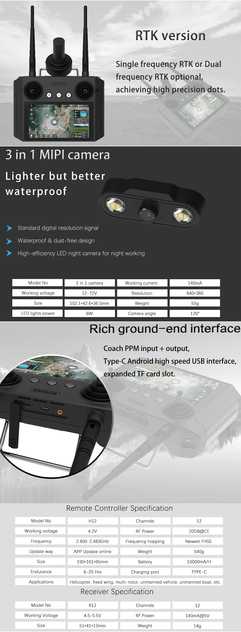 skydroid h12 transmitter has undergone a lot of optimization based on QGC, a better interactive interface, a larger controllable map field of viewing, the aircraft implements intelligent waypoint planning, automatic execution, automatic follow-up, and one-click home, highly provides working effectiveness in professional fields.