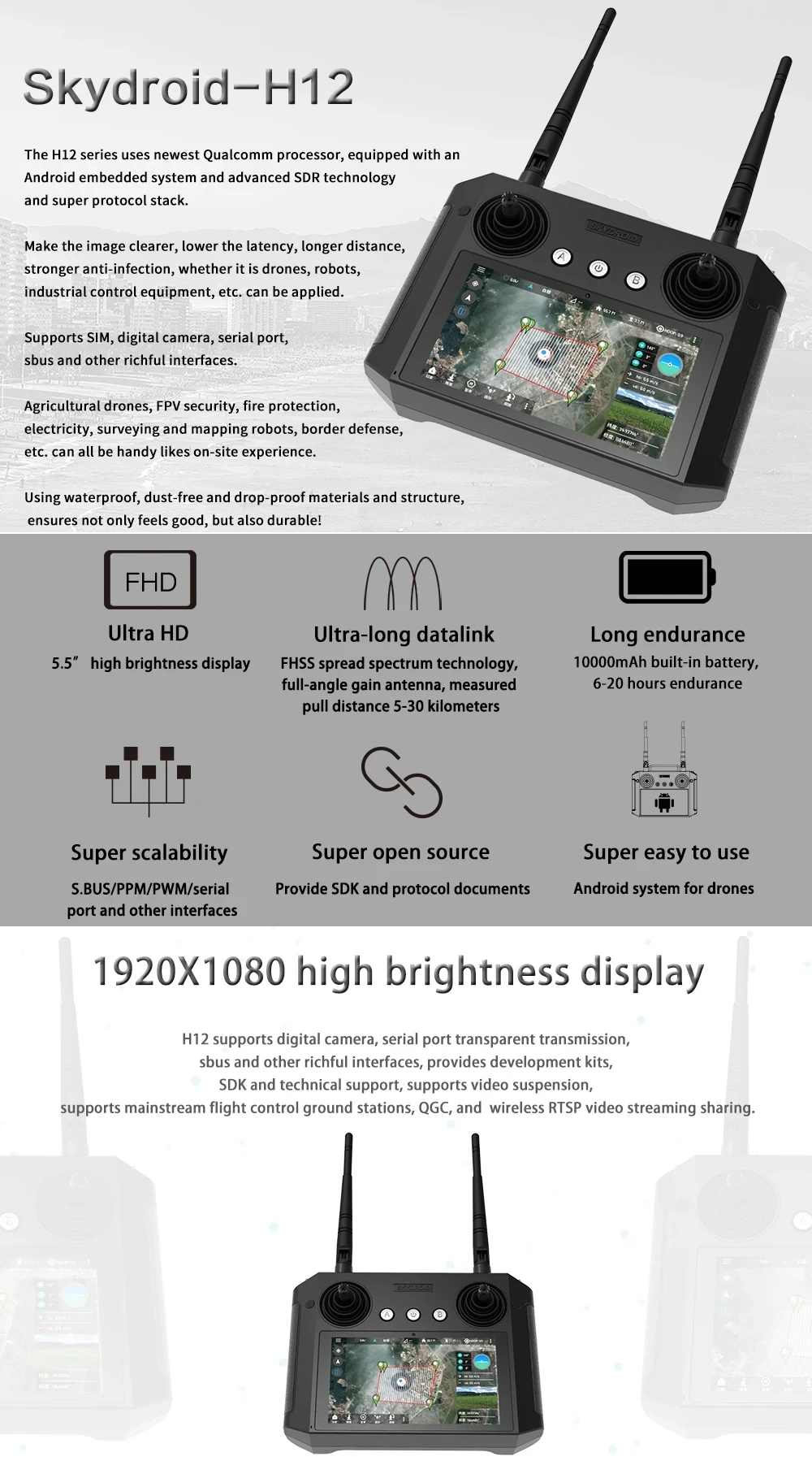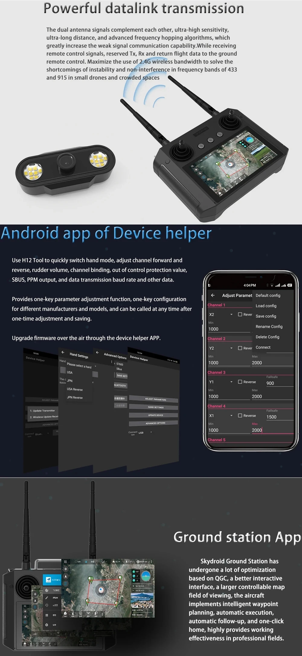 The Skydroid H12 Long Range Drone Radio System use the newest Qualcomm processor, equipped with an Android embedded system and advanced SDR technology and super protocol stack. Make the image clearer, lower the latency, long distance, stronger anti-infection, whether it is drones, robots, industrial control equipment, etc. can be applied. It can be widely used on agriculture drones, FPV security, fire protection, electric power, surveying and mapping robots, border defense, etc. The Skydroid H12 remote control is using waterproof, dust-free and drop-proof materials and structure, ensures not only feels good, but also durable!