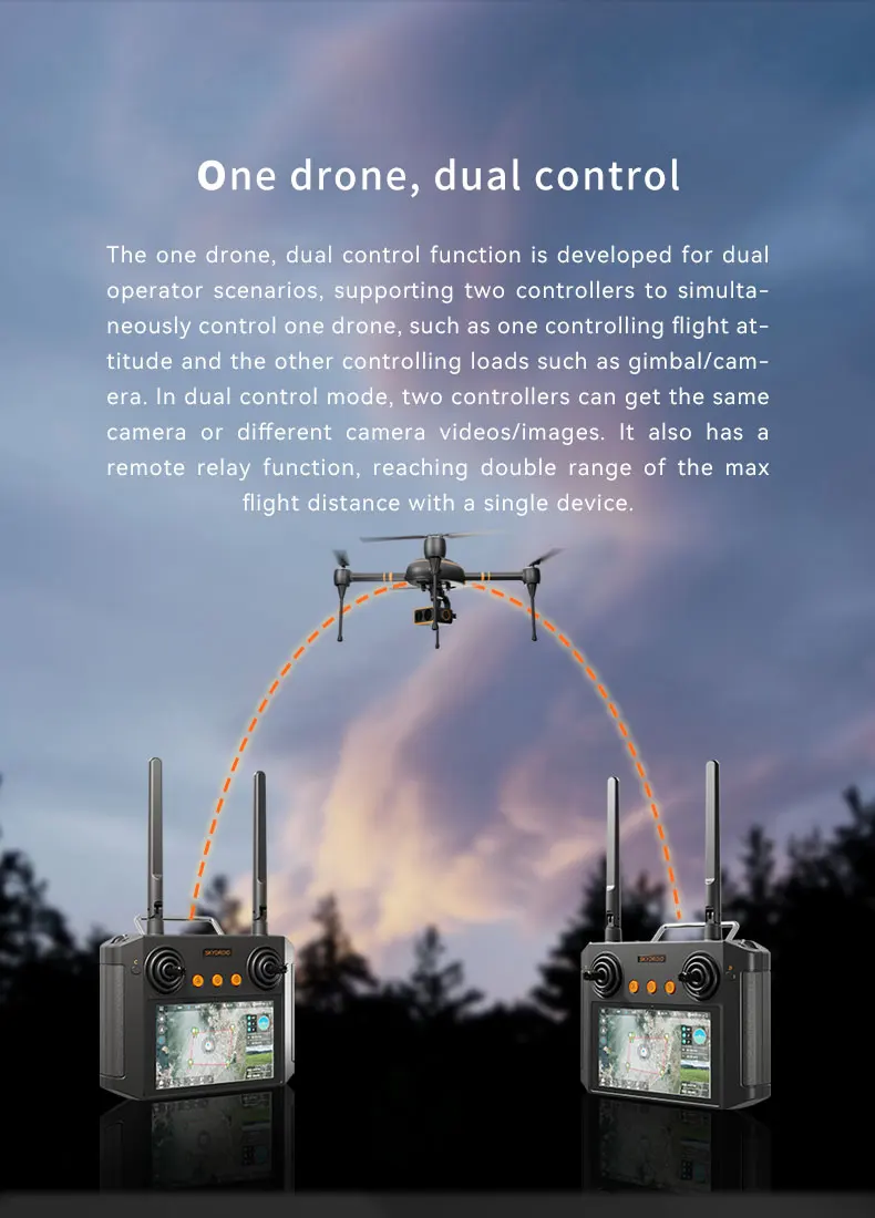 Dual Controllers for One Drone: Specifically designed for dual-operator scenarios, this feature allows two ground terminals to simultaneously control one sky terminal. One controller manages flight attitude, while the other controls payloads such as gimbal cameras and pods. This setup also supports real-time video streaming to network servers through mobile networks or Wi-Fi.