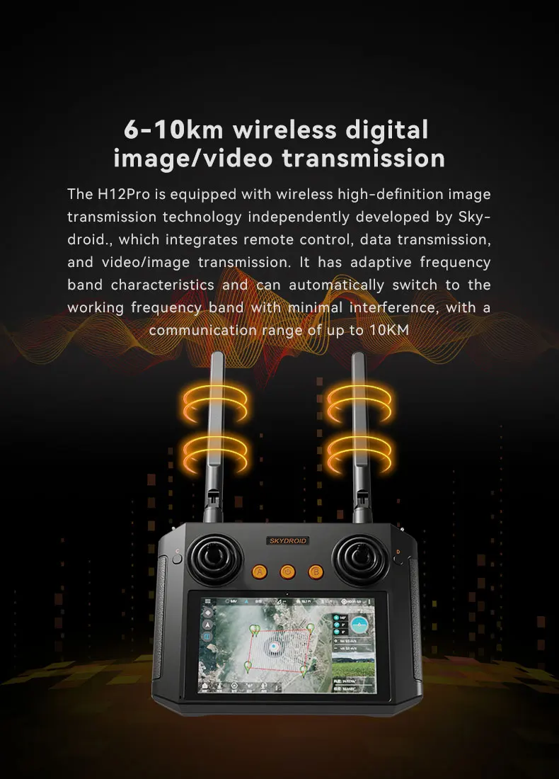 The Skydroid H12 Pro Remote Control is a cutting-edge solution for UAV enthusiasts and professionals, featuring advanced wireless high-definition image transmission technology developed by Yunzhuo Technology. This innovative system integrates remote control, data, and image links into one seamless unit, providing a comprehensive and efficient control experience. With adaptive frequency band capabilities, it automatically switches to the least-interfered working frequency, ensuring stable communication up to a distance of 10 kilometers.