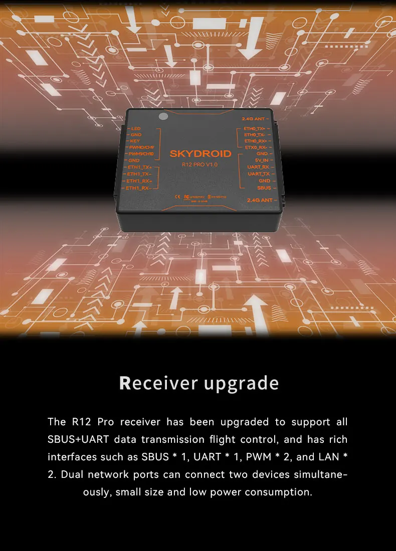 Receiver Upgrades: The Skydroid R12 Pro Receiver supports all SBUS+UART data transmission flight control, with interfaces including SBUS * 1, UART * 1, PWM * 2, and LAN * 2.