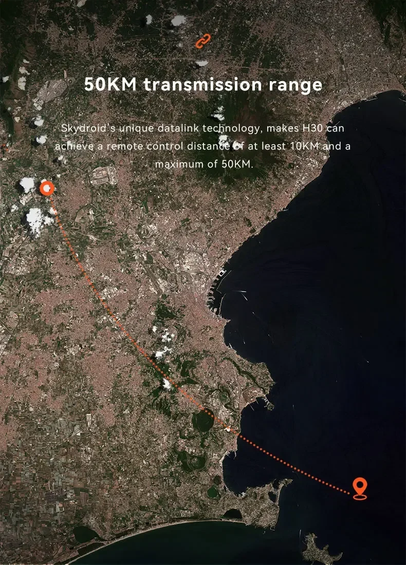 Extended Transmission Range: With Skydroid's unique digital image control link technology, the H30 can achieve a maximum video transmission distance of up to 50 kilometers.