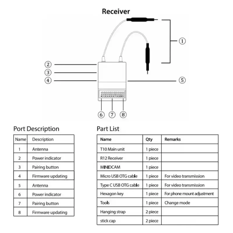 The SKYDROID R10 Receiver offers 10 channels for versatile control, supporting a working voltage of 4.5-5.5V and a current of 100mA. Compact at 50*31*12MM and weighing just 20g, it ensures reliable, efficient performance for various model applications.