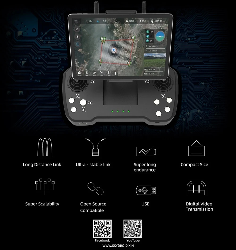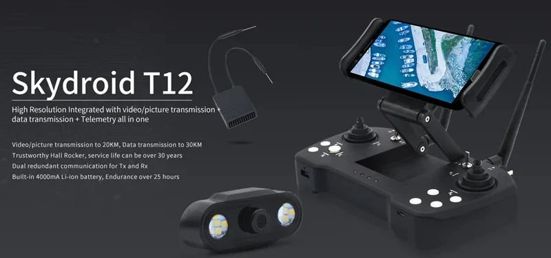 The SKYDROID T12 Remote Control offers advanced 20km digital map transmission and versatile camera options, including mini, three-body, and two-axis cameras. Paired with the R12 Receiver, it delivers reliable performance for plant protection machines and professional agricultural applications.