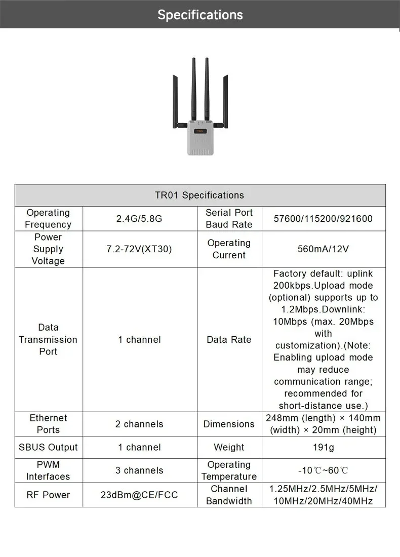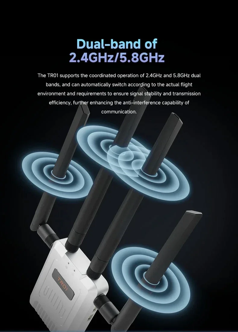 The SKYDROID TR01 Dual Band Repeater enables reliable long-range communication for drones and RC devices with dual 2.4G/5.8G modules, a 20KM range, and advanced anti-interference technology for seamless and secure operations.