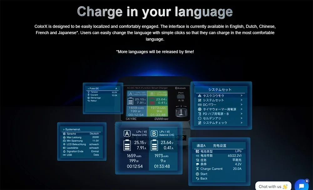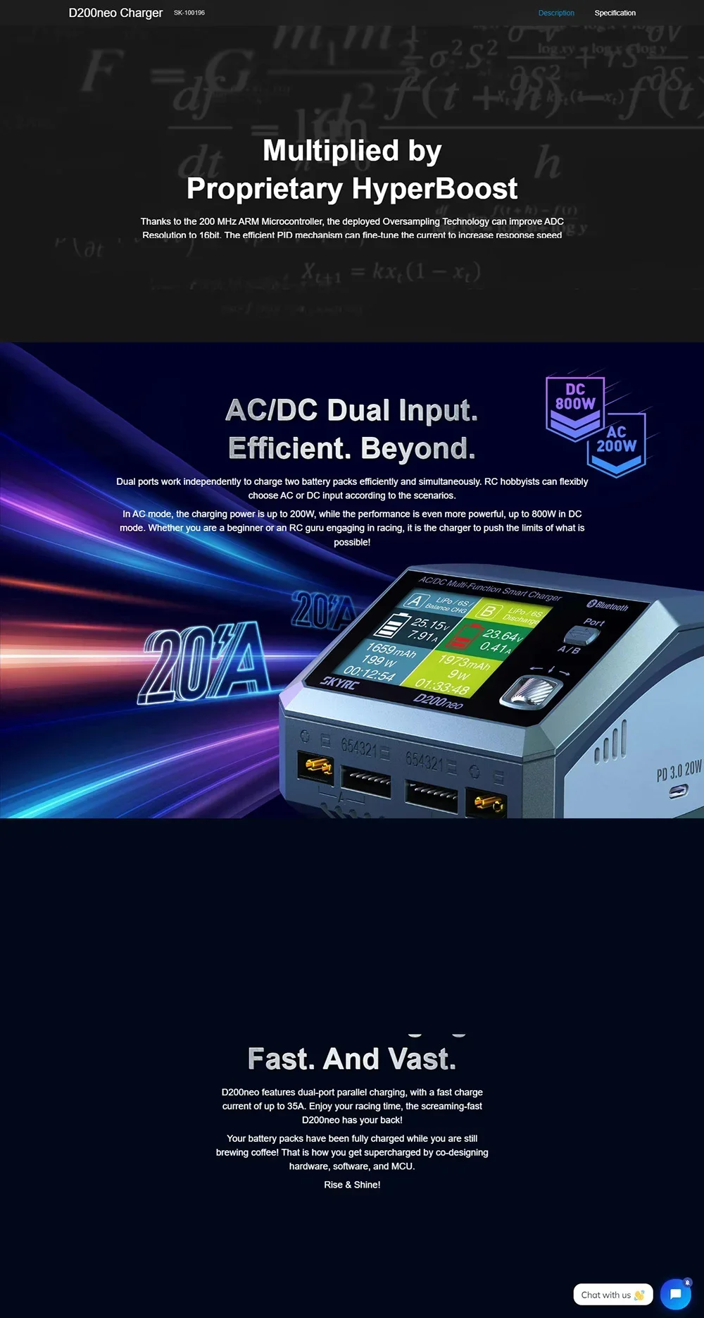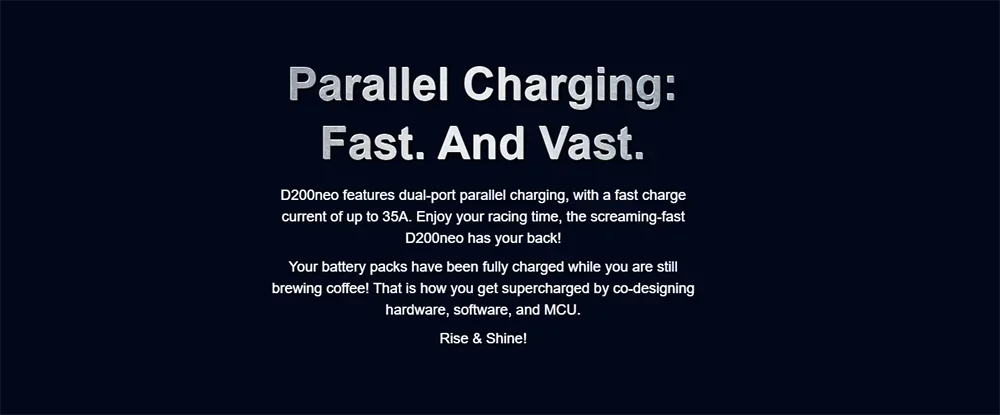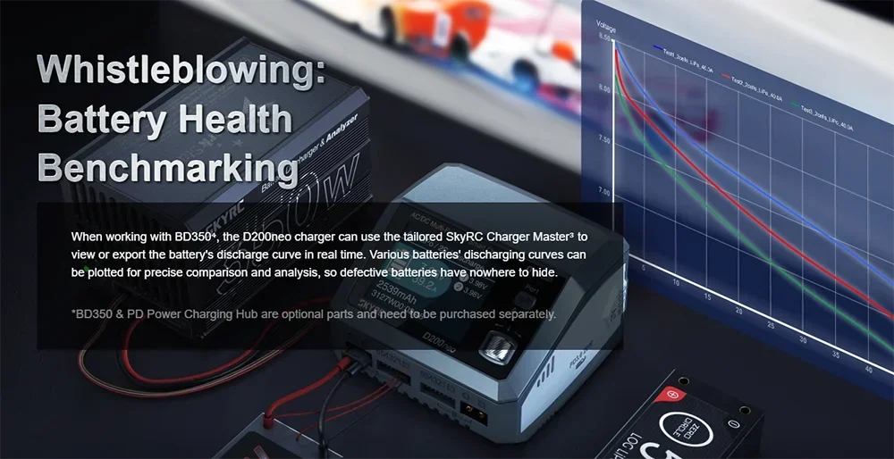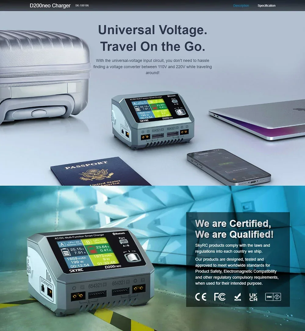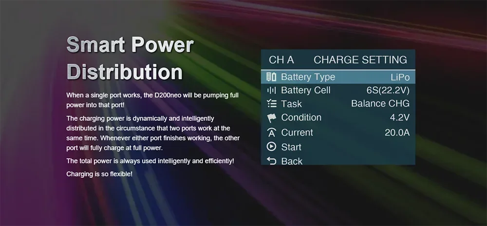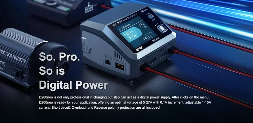 Skyrc D200neo has dual ports work independently to charge two battery packs efficiently and simultaneously. It is suitable with most of the batteries in the market. D200neo is not only professional in charging but also can act as a digital power supply. After clicks on the menu, D200neo is ready for your application, offering an optimal voltage of 5-27V with 0.1V increment, adjustable 1-15A current. Short circuit, Overload, and Reverse polarity protection are all included!