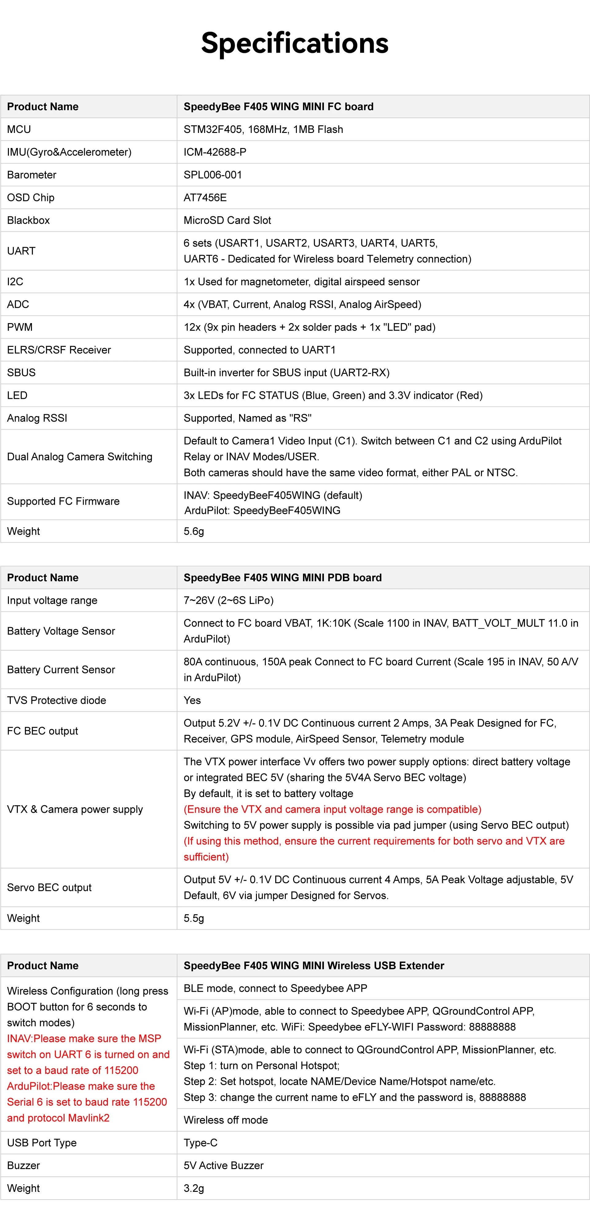 - Supports INAV and ArduPilot flight control firmware.