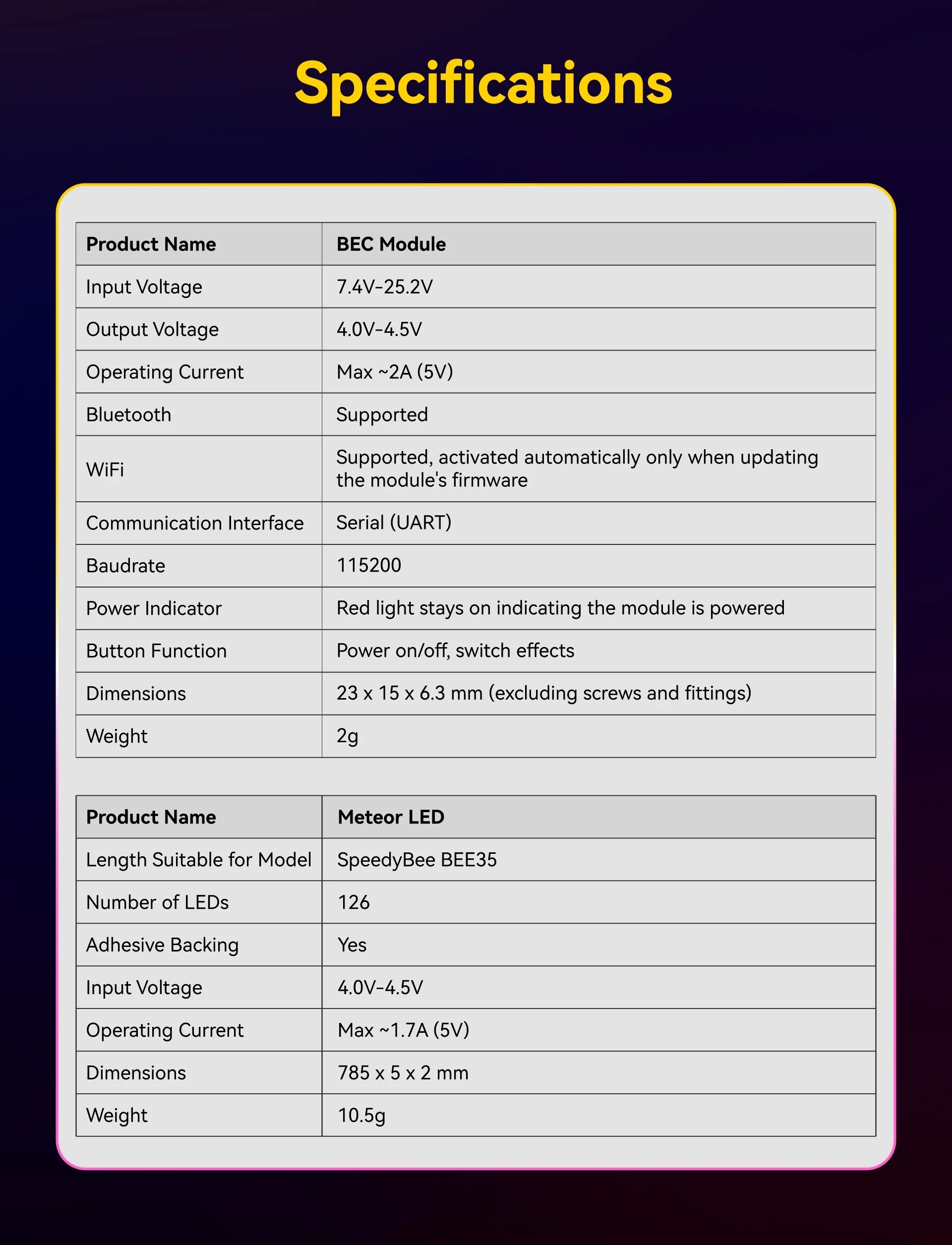 Enhance your drone with SpeedyBee Light Wireless LED Meteor Light Strip Lights. Featuring wireless tuning and compatibility with BOOT flight controllers, these lights offer vibrant illumination and effortless control for a superior, customizable flying experience.