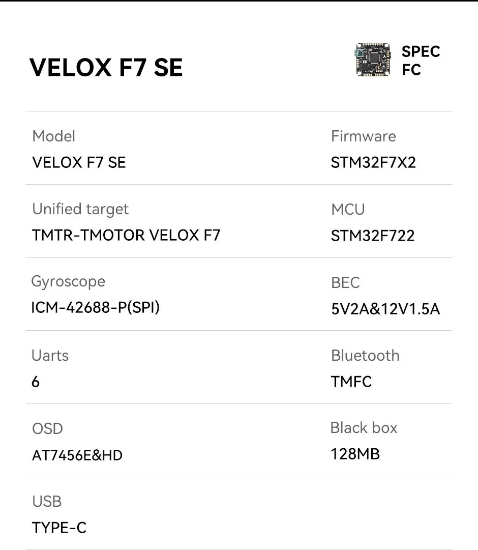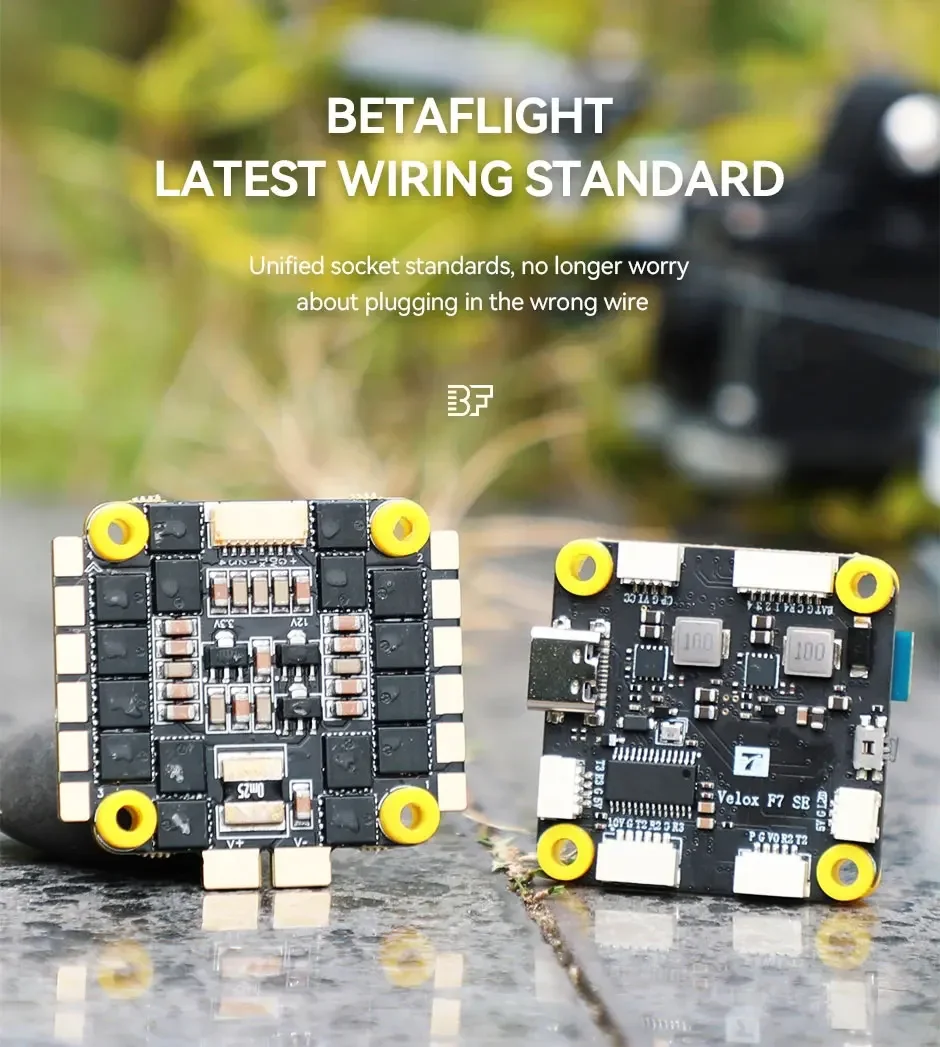 - The F7 SE stack comes with T-Motor Velox motors, ensuring a more comfortable and stable flying experience.