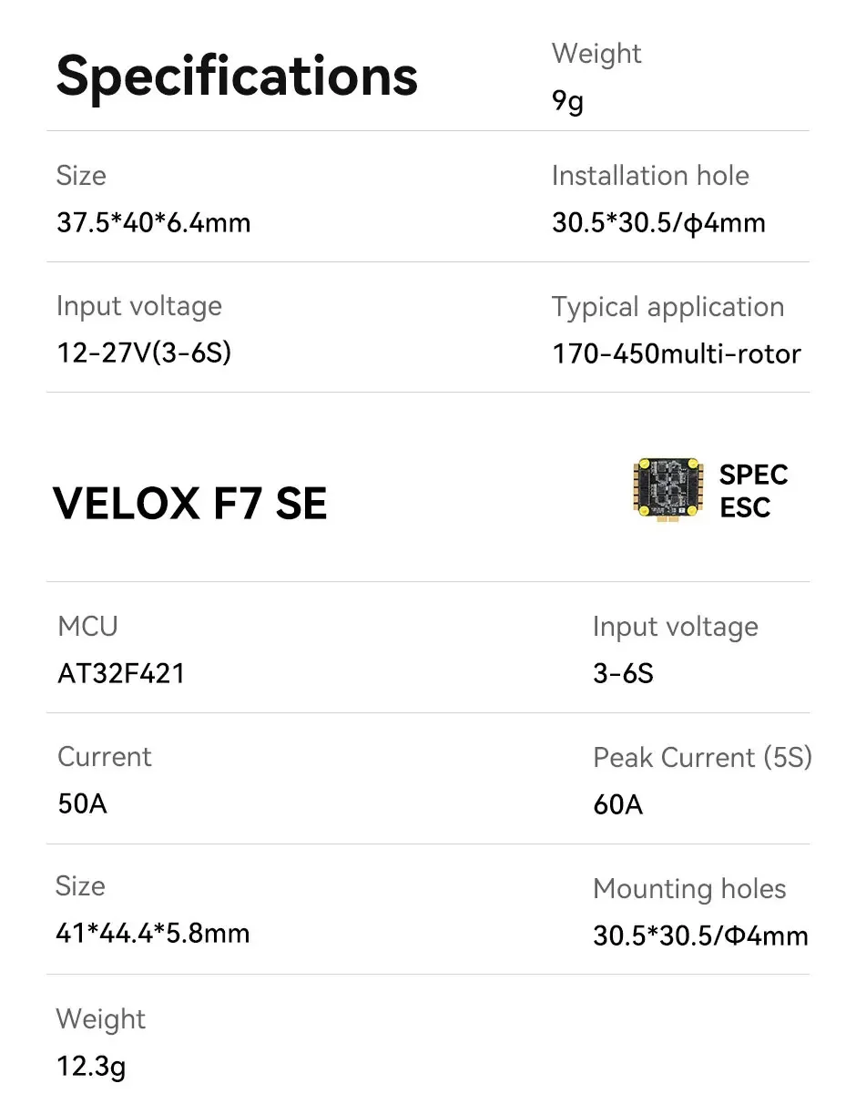 About T-MOTOR Velox SE Stack F7 SE+V50A 3-6S 4in1 ESC