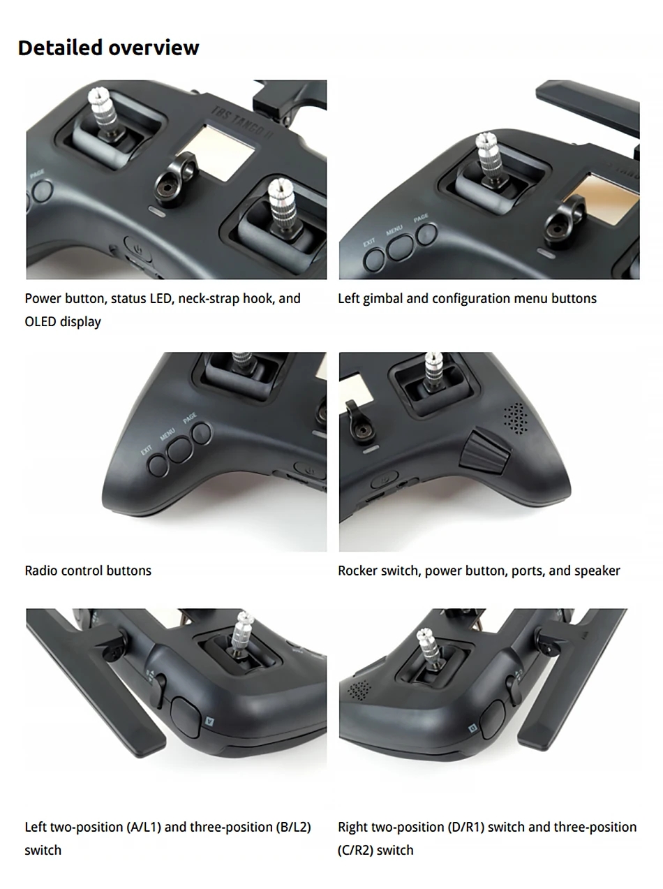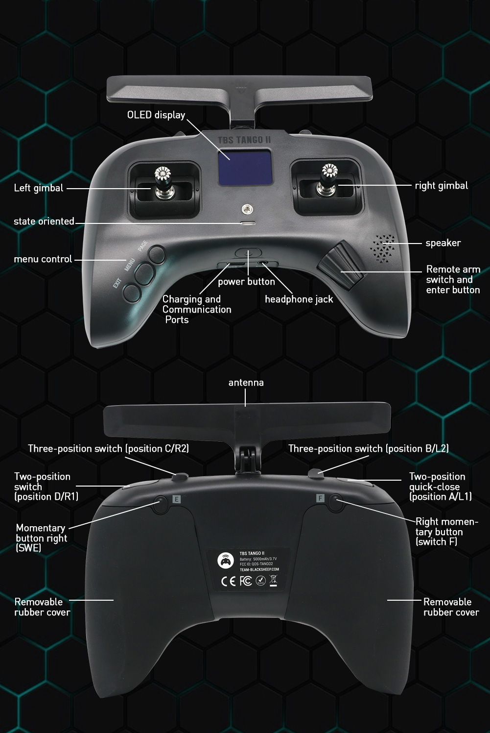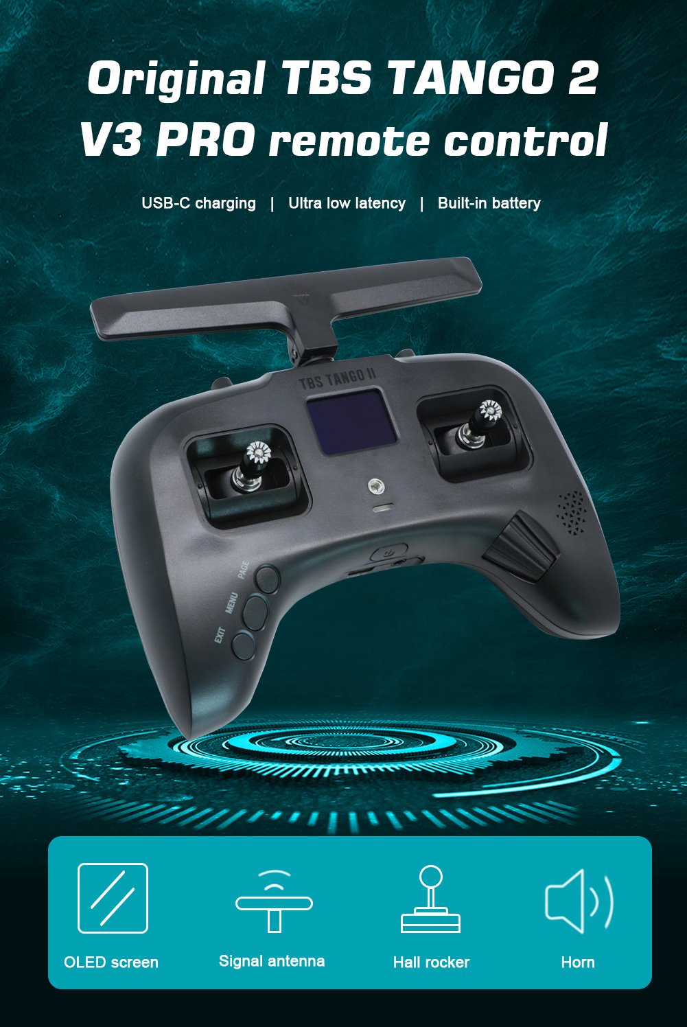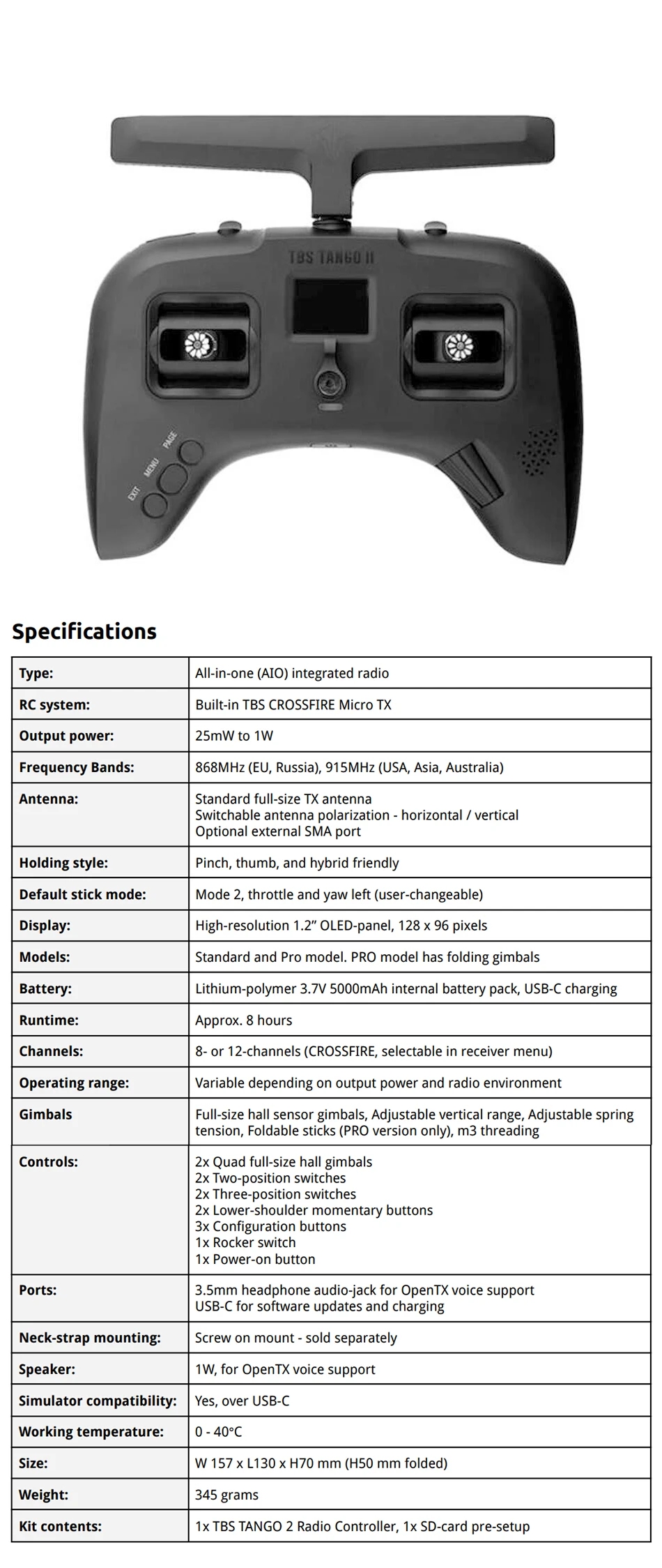 Team BlackSheep has been at the forefront of perfecting the interface between FPV drone and mind. The TBS Tango 2 changes how radio remote controls will be from here on out! Despite being the smallest remote control available, it comes with full size HAll gimbals, full-featured FreedomTX (temporary OpenTX fork), the lowest end-to-end latency of any remote and transmission system, unbreakable 3 & 2-position switches, open source operating system, built-in battery, USB-C charging, and so much more! It's not just a retouched game controller, it was designed from the ground up for R/C! The form factor and features make it the ideal take-anywhere, fly-anytime remote control.