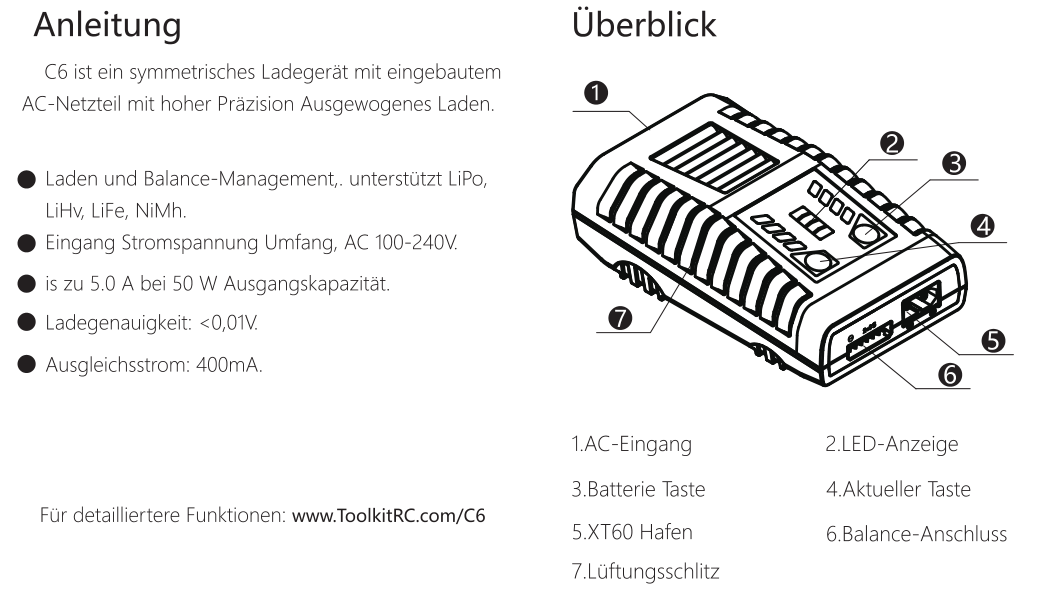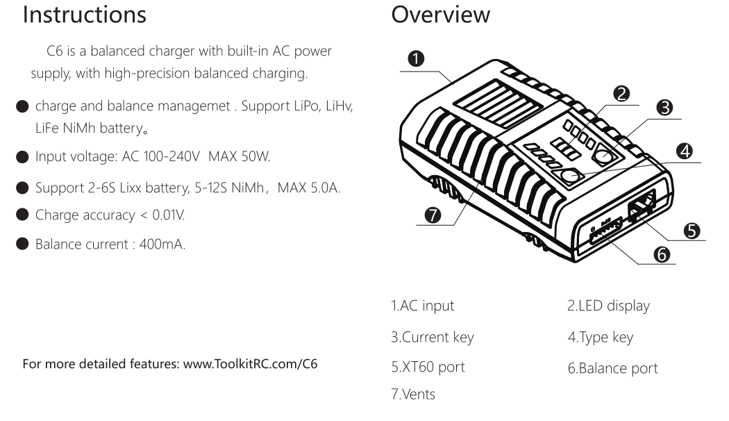 ToolkitRC C6 AC Charger 1-6S 50W 5.0A Lipo/LiHV