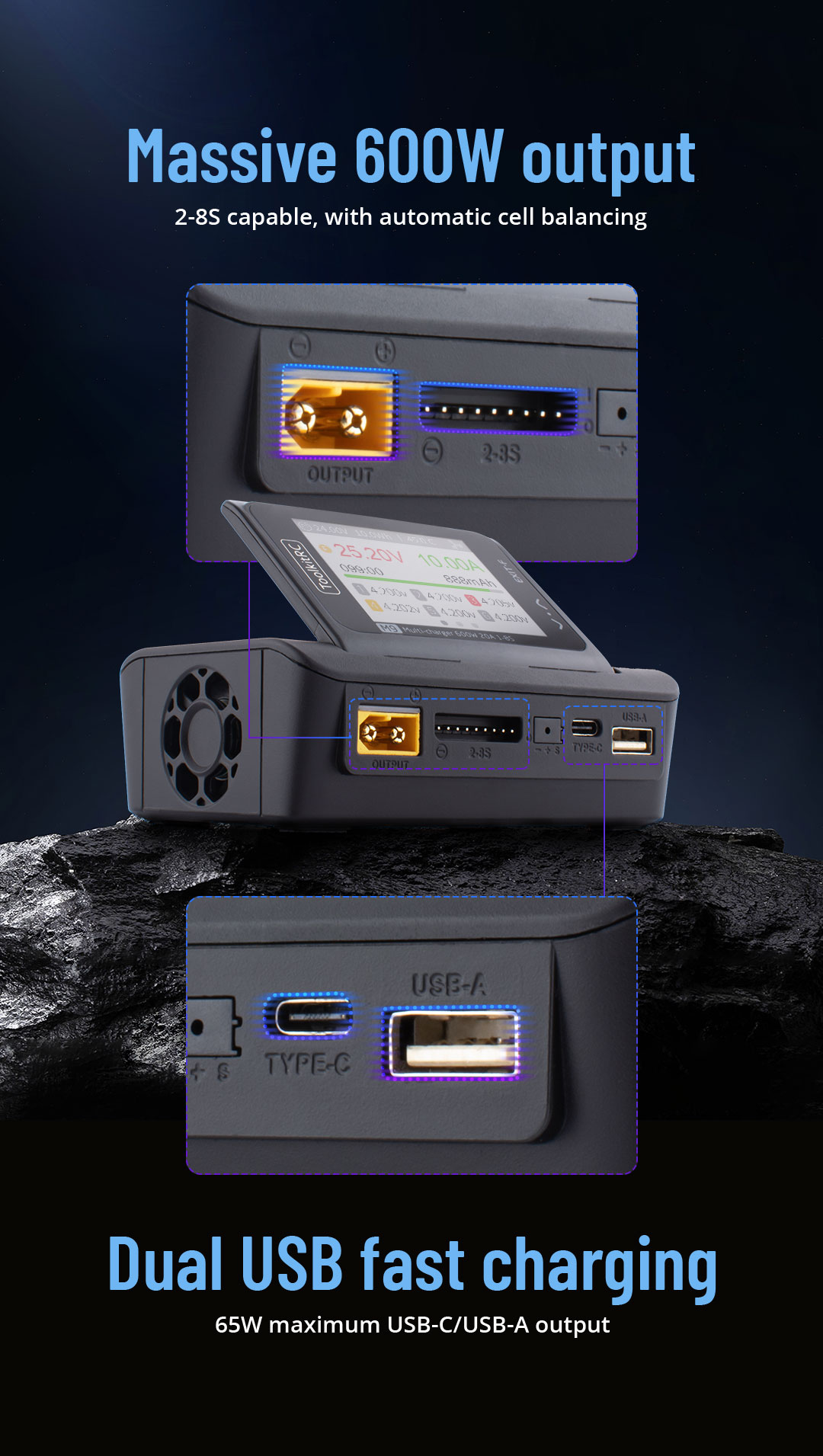 • Massive 600W output: 2-8S capable, with automatic cell balancing