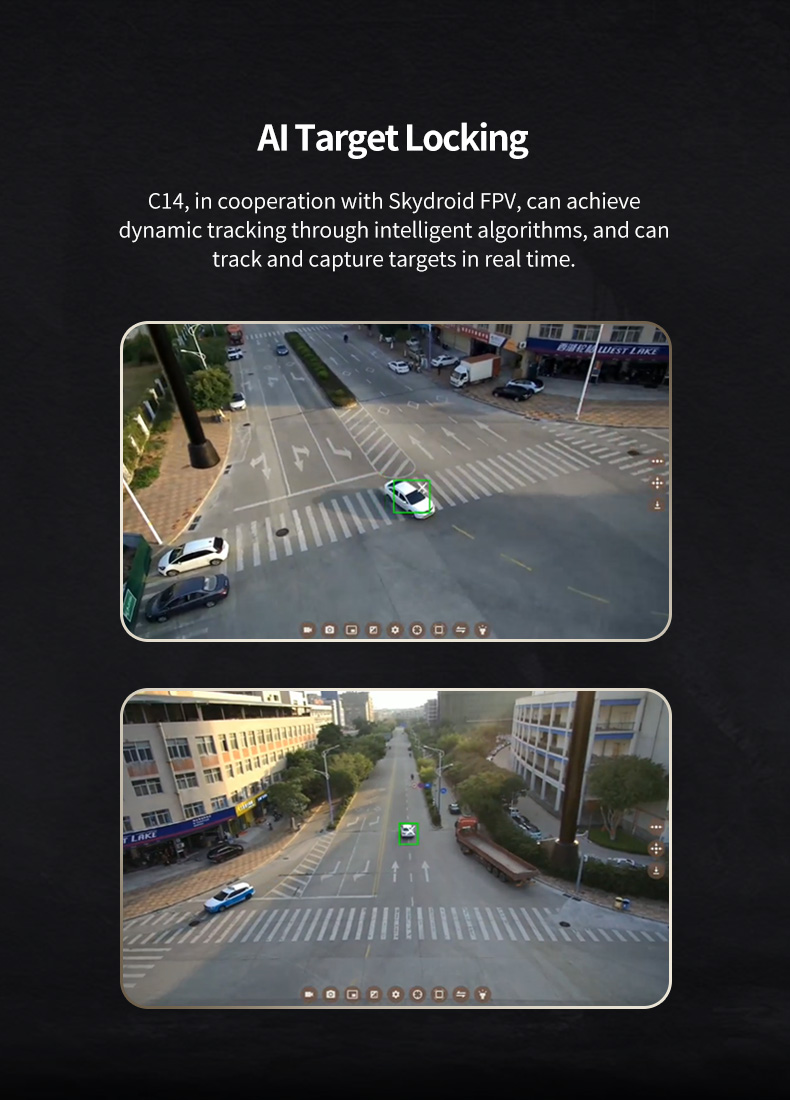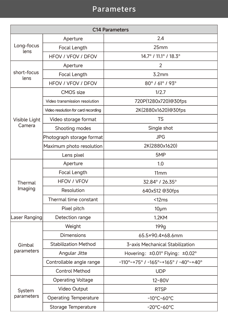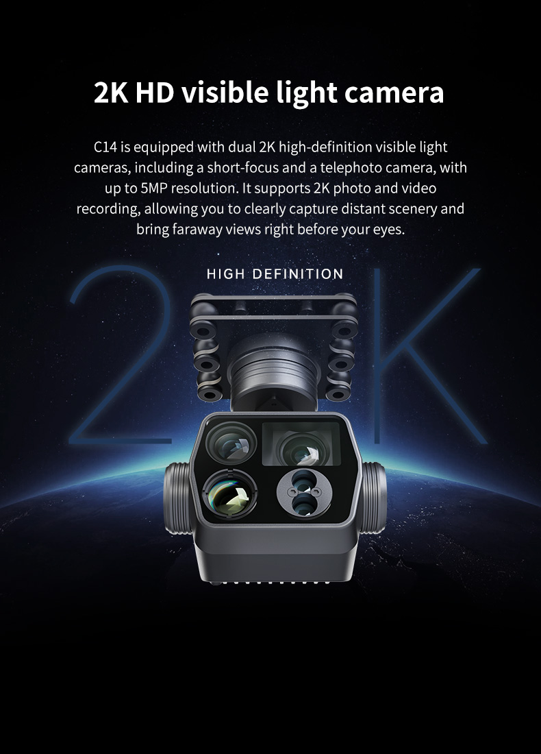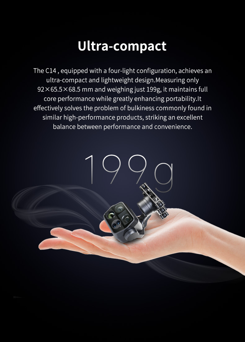 The C14 is a compact, high-definition, four-lamp mechanically stabilized gimbal. It utilizes a new-generation imaging chip, integrating distortion-free high-definition short-throw and long-throw cameras with an effective pixel count of up to 5 megapixels. It boasts powerful 2K video recording and photo-taking capabilities, supporting 100x hybrid electronic zoom (59x short-throw + 41x long-throw), enabling clear capture of distant objects. Equipped with a 640×512 resolution thermal imaging camera, it provides a wide field of view and clear images, allowing for long-distance observation of various heat sources. Combined with a laser rangefinder module, the effective range can reach up to 1.2 kilometers. Employing an industrial-grade three-axis stabilization structure, it significantly reduces image jitter, maintaining consistent image stability. It can be applied in fields such as fire rescue, animal protection, and security monitoring.